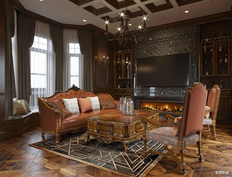 書(shū)房護(hù)墻板是由白楓木皮拼接的花鬘圖案,顏色層次分明,立體感超強(qiáng),營(yíng)造了滿滿的美式鑲嵌藝術(shù)感。深沉木色邊柜在護(hù)墻板上延伸,逐漸浸染了古銅色的家具和燈飾,結(jié)合著拱形羅馬柱,塑造出端雅大方的環(huán)境氛圍。