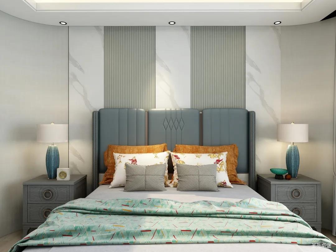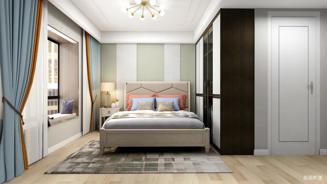 主臥的木飾護墻配以淺綠與魚肚白相間,色彩清新自然,層次分明。實木質感與清新色彩,為休憩時刻注入強烈的氛圍感與隨性感。