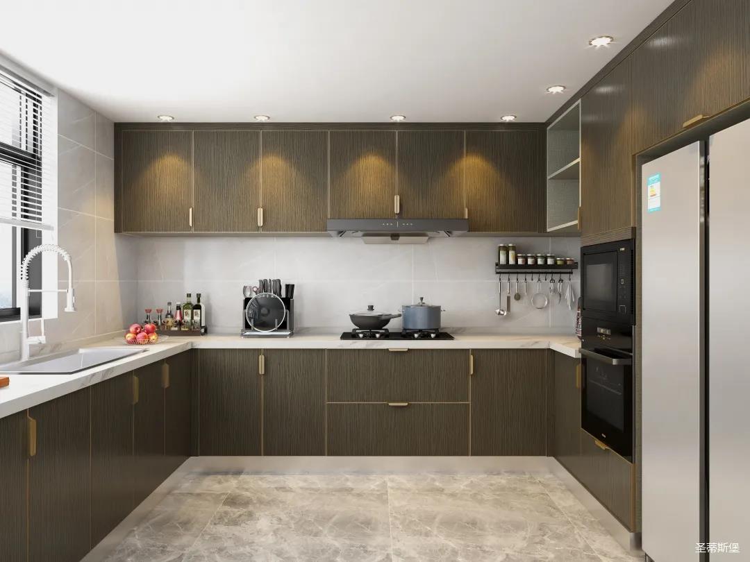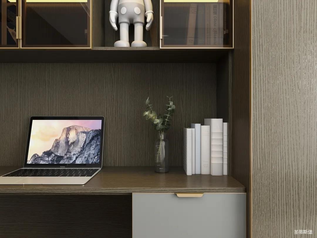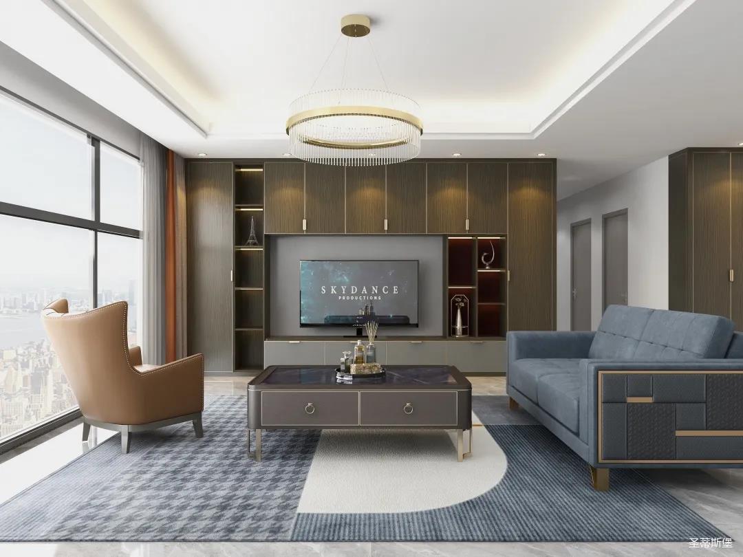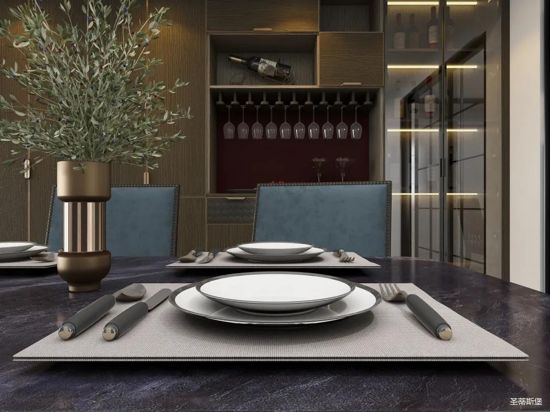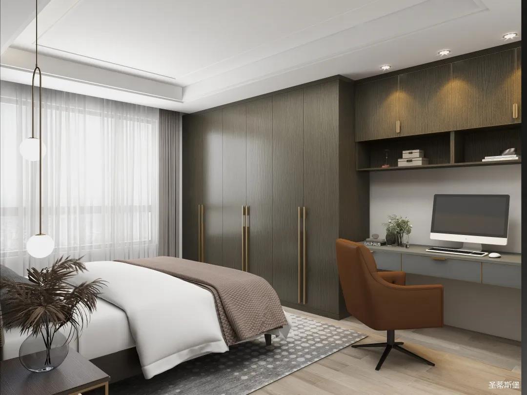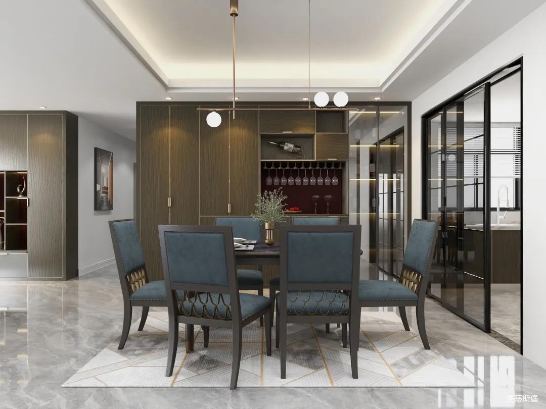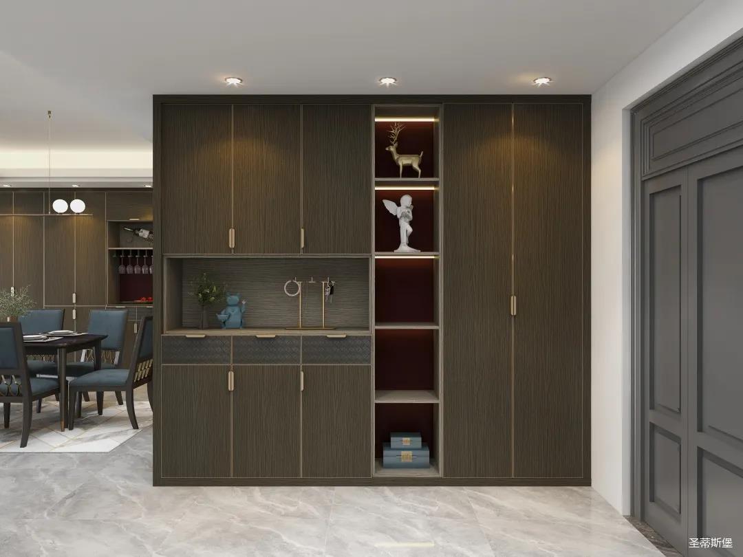 材質的交替與光影的變換,具有濃濃的現代簡奢色彩 。 獨一無二的英倫爵士灰定制柜,由延邊鑲嵌的香檳金拉絲金屬分割,線條流暢且奢華,不僅代表著時尚,也崇尚了實木韻味。設計師將現代、實用、精致的藝術設計風格應用其中,更是精致生活方式的藝術演繹。在平靜的空間中表現出獨特的藝術骨感,滿足我們對精致生活的精神追求。