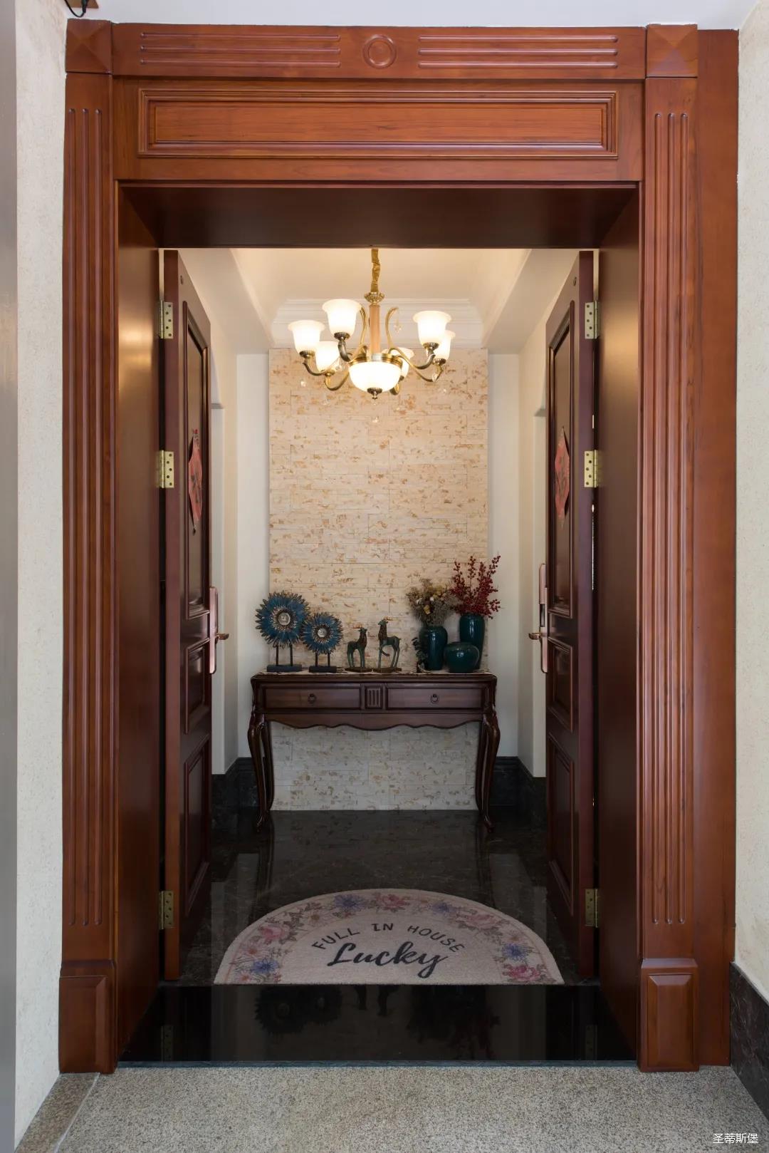 入戶玄關雙開門設計,儀式感滿滿!地面定制的瓷磚貼花設計,典雅又大方。核桃實木玄關桌,加上精致的擺件,經典美式復古吊燈,不著痕跡的展現出居者對生活的激情,魅力吸睛,從入戶開始感受古典氛圍。