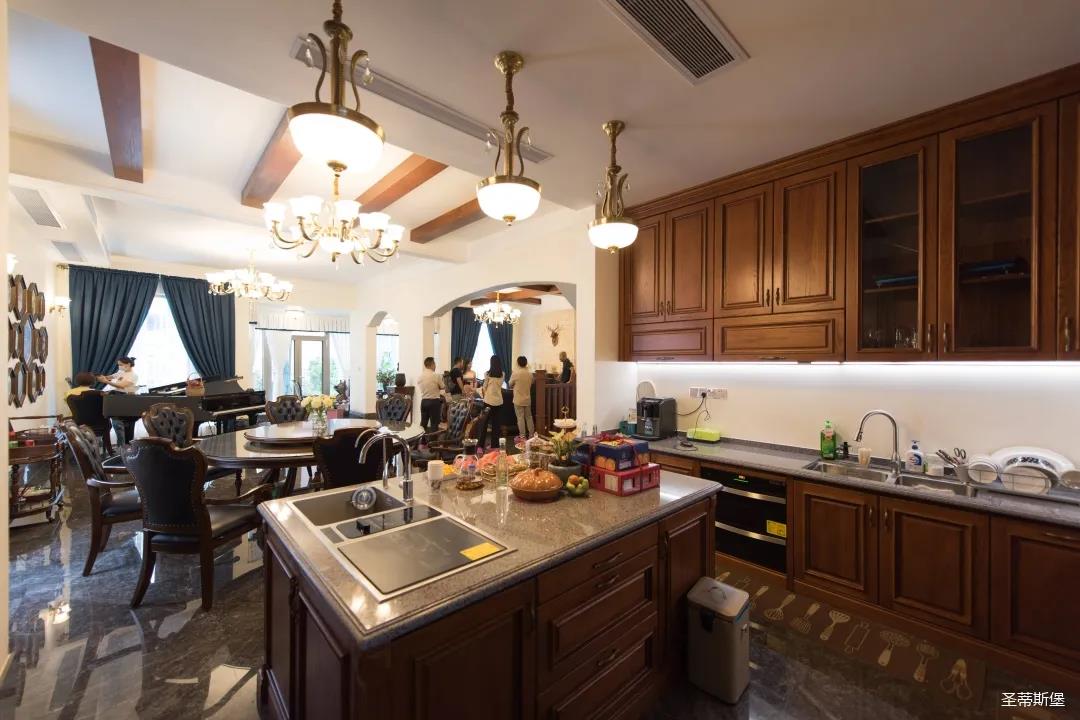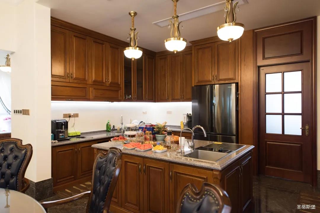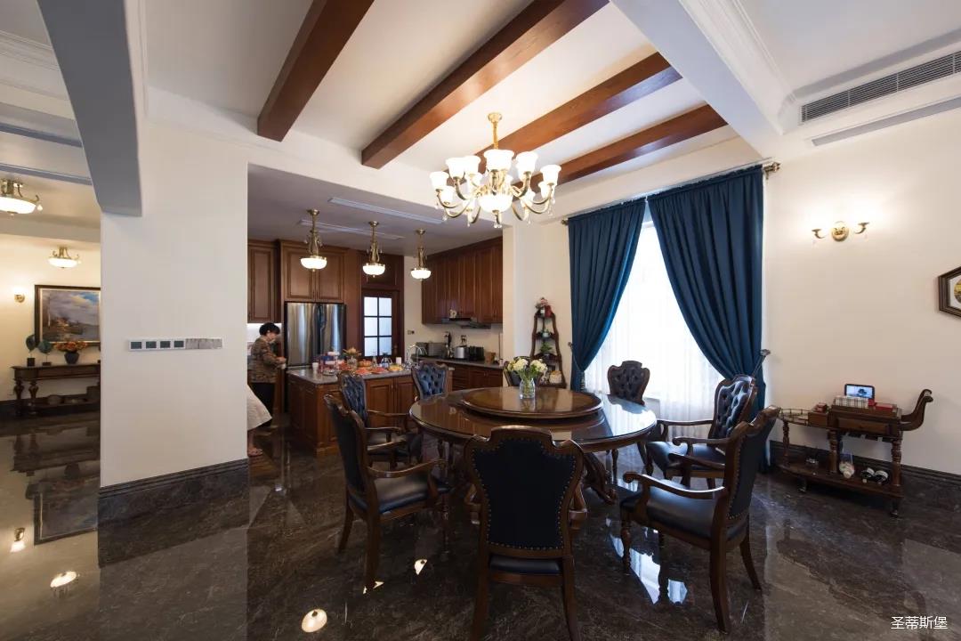 玄關進入轉角處,以穩(wěn)重大氣實木為主色調的開放式中西餐廚空間,將一體化無隔斷設計貫徹到每個細節(jié),采用了親膚真皮質感的餐椅,手工雕刻的曲線讓原本硬朗的空間變得格外優(yōu)雅,自上而下,構成完整的美式空間氣度,在每天的生活點滴間,沉浸在美式風情中,更加隨性舒適。