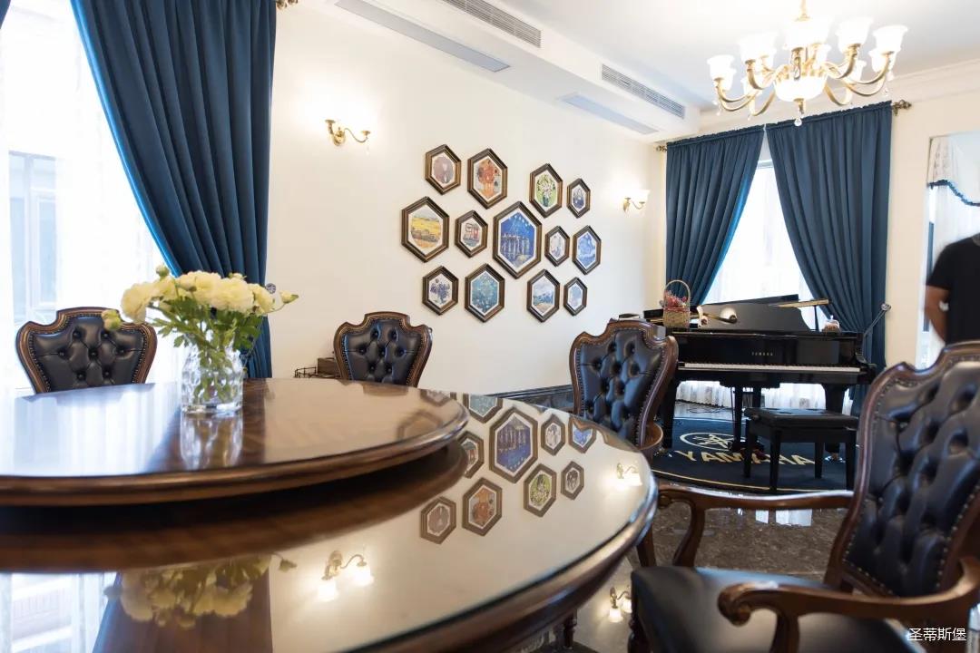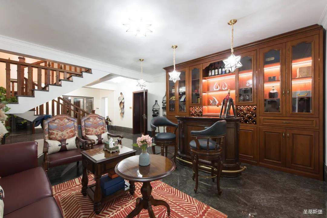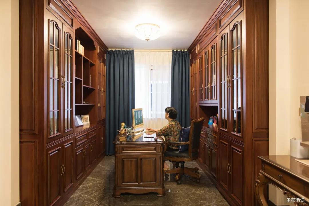 業(yè)主夫婦非常熱情好客,平時工作之余也會在家里邀三兩好友一起觀影,觀影室的整體設計容納著濃烈的古色古香,長方形圖案排列搭配復古的家具與配飾,精細的雕花藝術,于細節(jié)之間演繹著精致生活。不管時光如何輾轉變換,家的定義從不曾改變,它撫慰著我們的心靈,承載著我們的喜樂,從細膩的質感中感知家的點滴變化,才是對生活最真實的寫照。