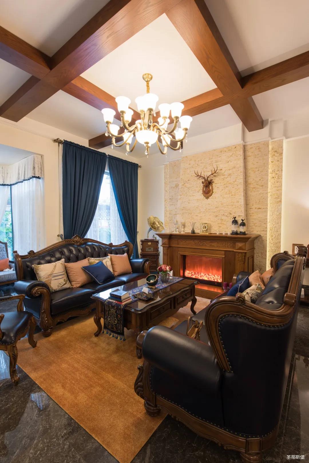 歐美實木吊頂設計,與沙發(fā)茶幾上下呼應,相得益彰,提升了空間層次感。