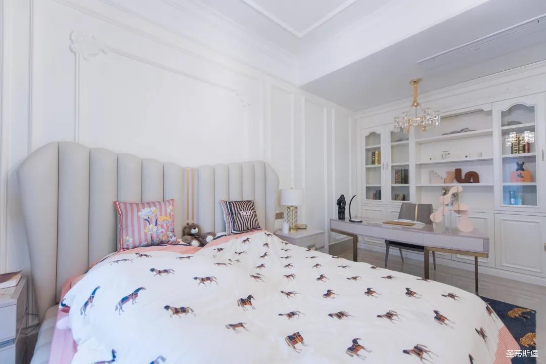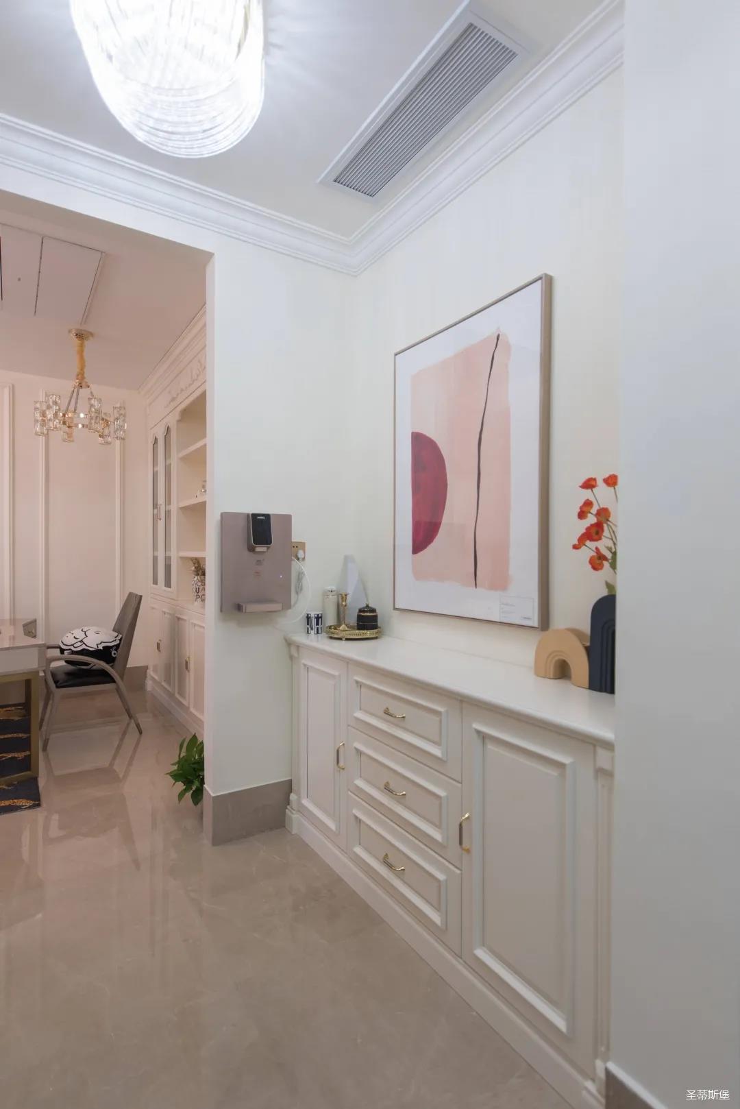 經過房間玄關過道,一眼就被這夢幻的景象給征服,摒棄繁雜,少許的金色元素點綴,予以空間輕奢細膩的質感,卻又不失美式韻味。