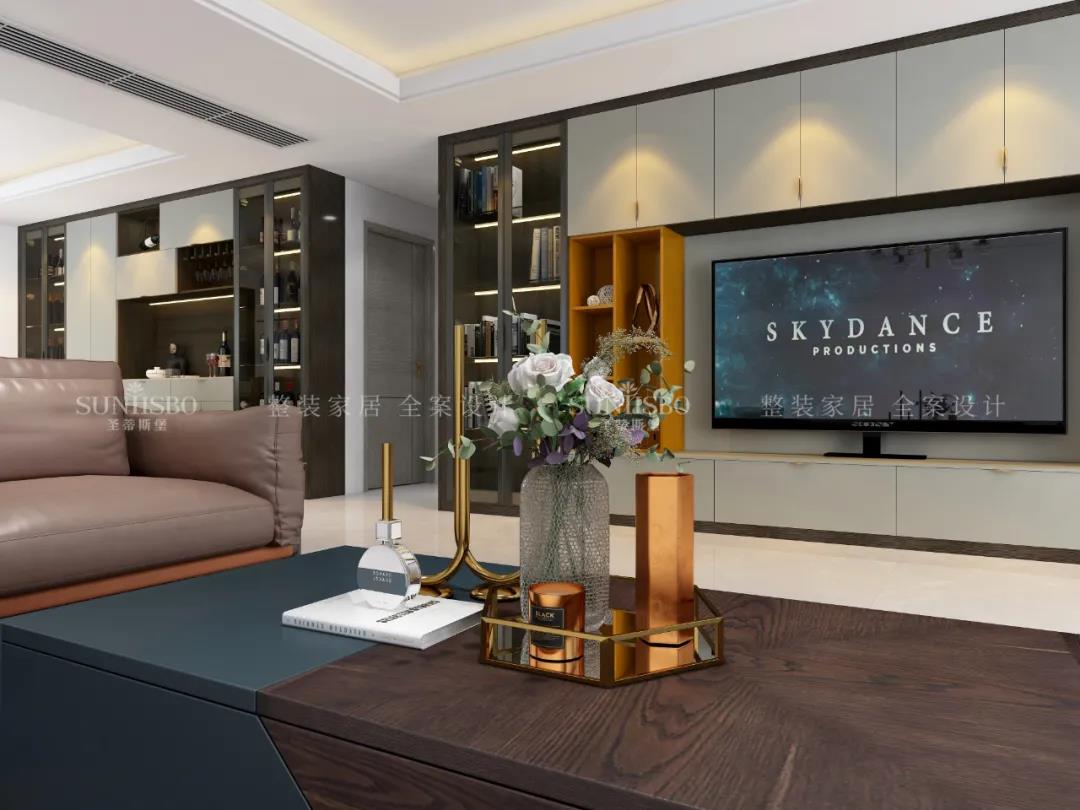 客廳一面置頂的定制柜,大大增加了空間收納,也將電視背景墻的觀賞性發揮到極致。淺灰與明亮橙的“動靜”屬性, 與沙發上的愛 馬仕橙相呼應,從空間中漫溢出歡樂和跳動的樂章,回響生活中那一抹絢麗和精致,同時也擁有著對立且和諧的高級范兒。