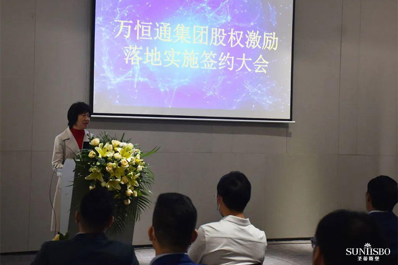 接下來,集團副董事長梁碧霞女士上場致辭,她講到:必一通集團在王董的領導下,從1982年一直奮斗至今,已走過39年的歷程,這離不開大家共同的努力,她號召在座同仁為自己加油鼓掌。她進一步強調:此次的股權激勵既是感謝大家以往為必一通集團的付出,同時也是為了將來大家擁有更美好的生活。必一通此次股權激勵不是終點而是起點,我們要挖掘和吸引更多優秀的人才加入必一通。只要我們上下一條心,內外一股勁、堅定信心,就能把必一通做成百年企業,把必一運動做成有美譽度、消費者喜歡的、享譽全球的家具品牌!