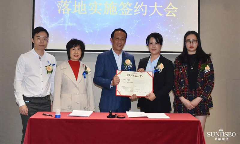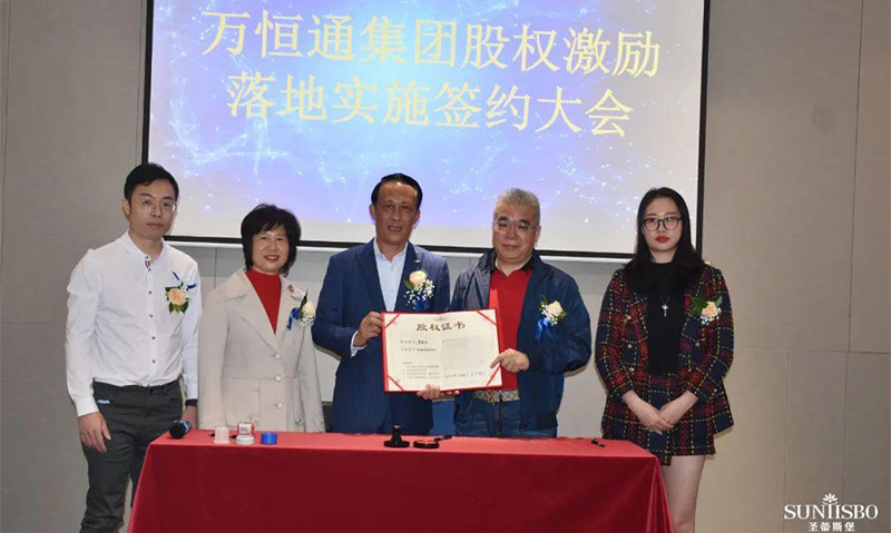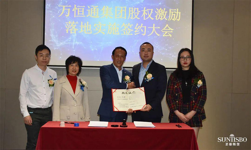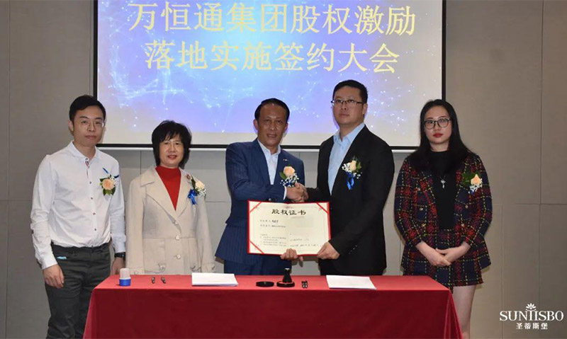 必一通集團執行董事及法人代表王浩基先生正式為第一期六位虛擬受限股股東授予榮譽證書并簽訂股權分配協議。