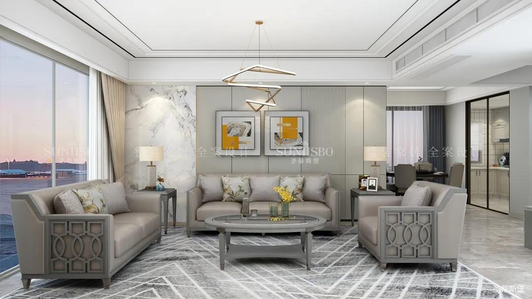 客廳在太陽的余暉下襯得柔和樸素,通透自然。超大江景落地窗,引入充足的自然光線灑向屋內(nèi),整體空間去除繁復(fù)的設(shè)計(jì),以柔和的線條作為鋪設(shè),沙發(fā)側(cè)面與地毯中的幾何造型組建了一個(gè)極富藝術(shù)感的空間,采用天然實(shí)木材質(zhì)制作的家具和織物,色彩淡雅且不張揚(yáng)。隨處可見的藝術(shù)造型裝飾,無一不展示著美式格調(diào)中輕奢的韻味。