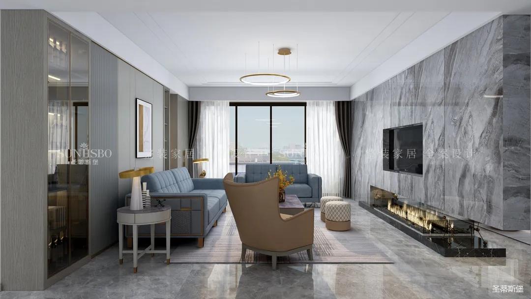 精細結構下沙發(fā)角幾的微金屬結構,干凈利落,彰顯質感。整面大理石背景墻將電視設計為壁龕結構,底部的裝飾壁爐讓家的溫馨感再度升級。