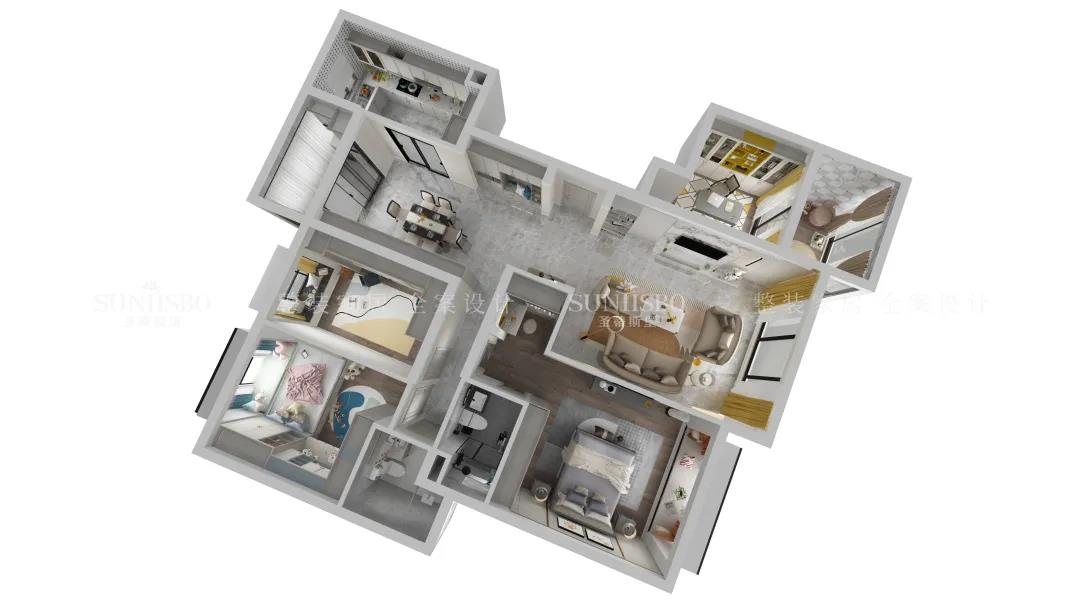 兒童房摒棄了傳統(tǒng)榻榻米的呆板與嚴肅,延續(xù)主臥輕奢雅致的空間氛圍,以木質為主材質,利用面板的線條帶來視覺上的延伸,將童趣與理性相融表現(xiàn)兒童應有的學習氛圍與生活習慣。開放式展示區(qū)應用藍色點綴,再次強化了空間專屬兒童的活躍格調,也呈現(xiàn)了設計師在材質與色彩運用上的精細與專業(yè)。