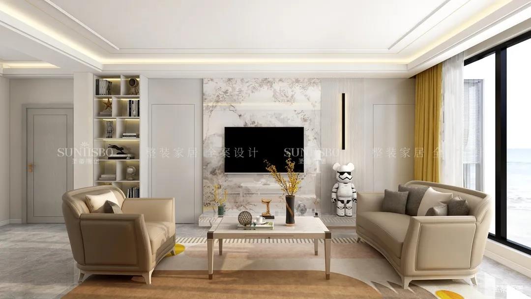 客廳設計置頂展示柜和大理石,實現(xiàn)了現(xiàn)代和輕奢風格間的均衡組合。溫柔莫蘭迪色調的沙發(fā),細節(jié)的實木底座和人性化的環(huán)抱式設計讓空間更添溫馨的氣息。