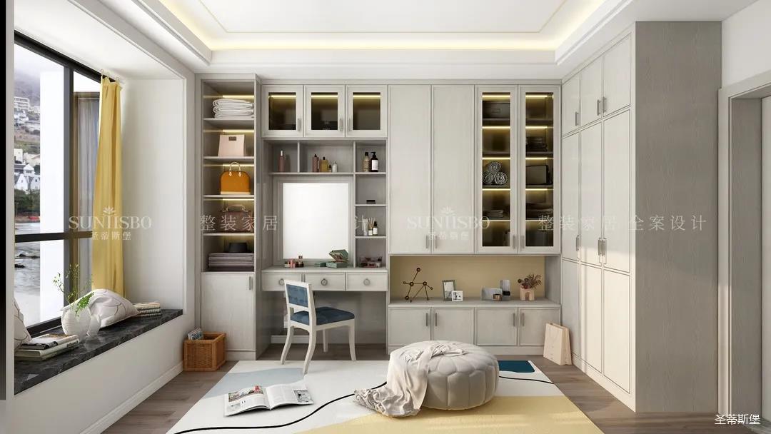 衣帽間是女主特別要求的,設計是將房間打造成衣帽間系統(tǒng),采用L型布局,壁掛式設計,讓穿搭動線更順暢,視覺上也更通透,可直觀的展示女主人穿搭品味。玻璃層板與背板花色的結合,精致靈動,成為時尚與輕奢的寫照,封閉區(qū)衣柜的合理格局規(guī)劃,完美詮釋現(xiàn)代輕奢風于當代定制中的前瞻性。