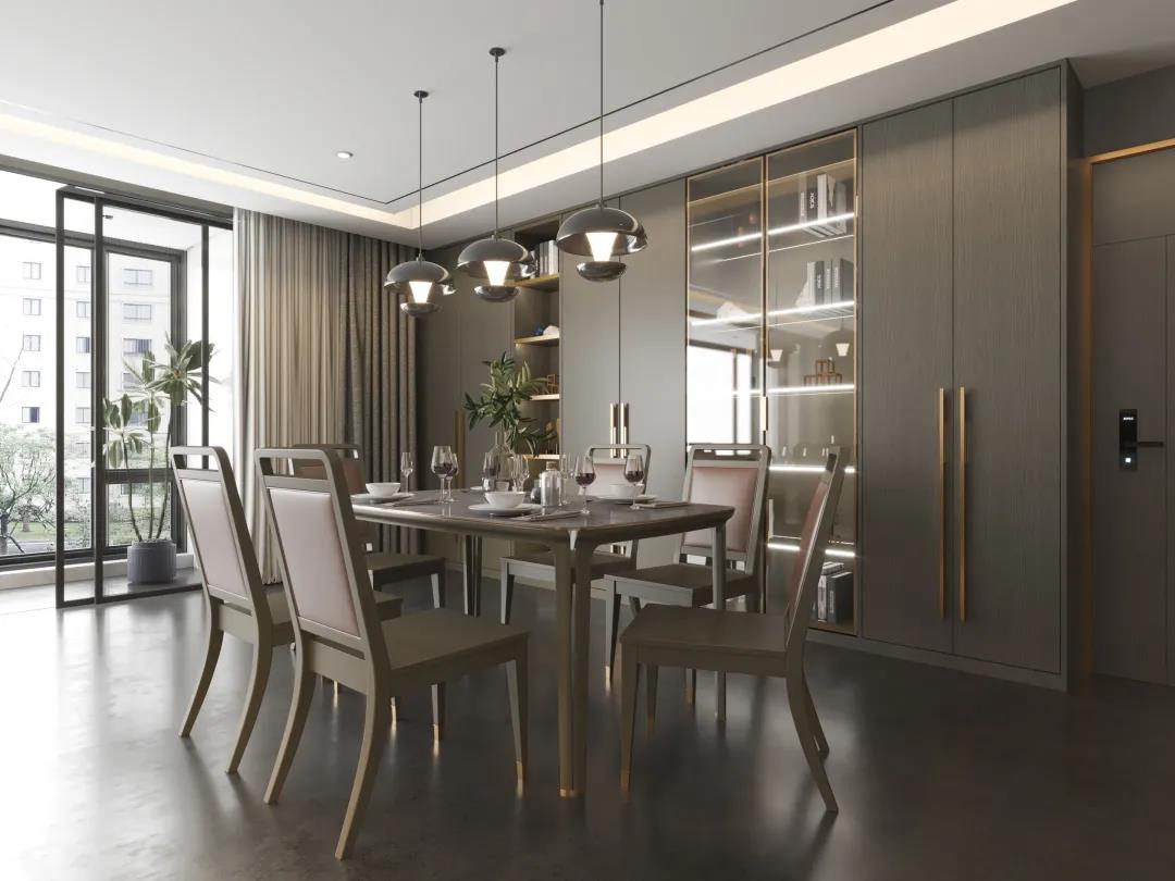 餐桌以簡潔干練造型為主,高級百搭的灰色調,軟包真皮,金屬鑲嵌的細節,打造出悠閑奢華、優雅精致的風格,讓家的味道從一日三餐中抵達內心深處。